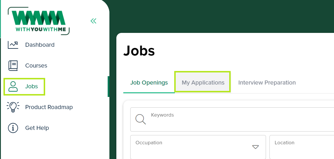 How do I keep track of my job applications? Log into your WithYouWithMe Account, click on "Jobs" on the left of the platform, and there should be a tab that says "My Applications".