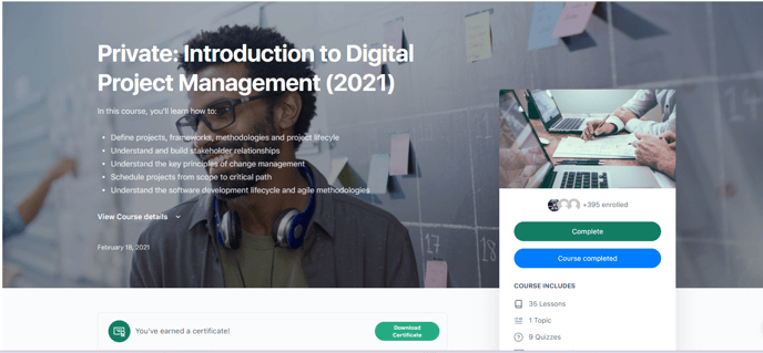 Under the Banner you will see a link to Download or Reprint your course certificate.